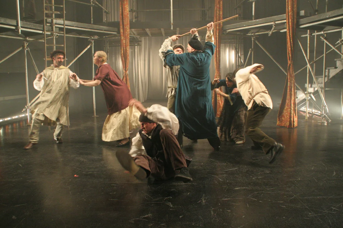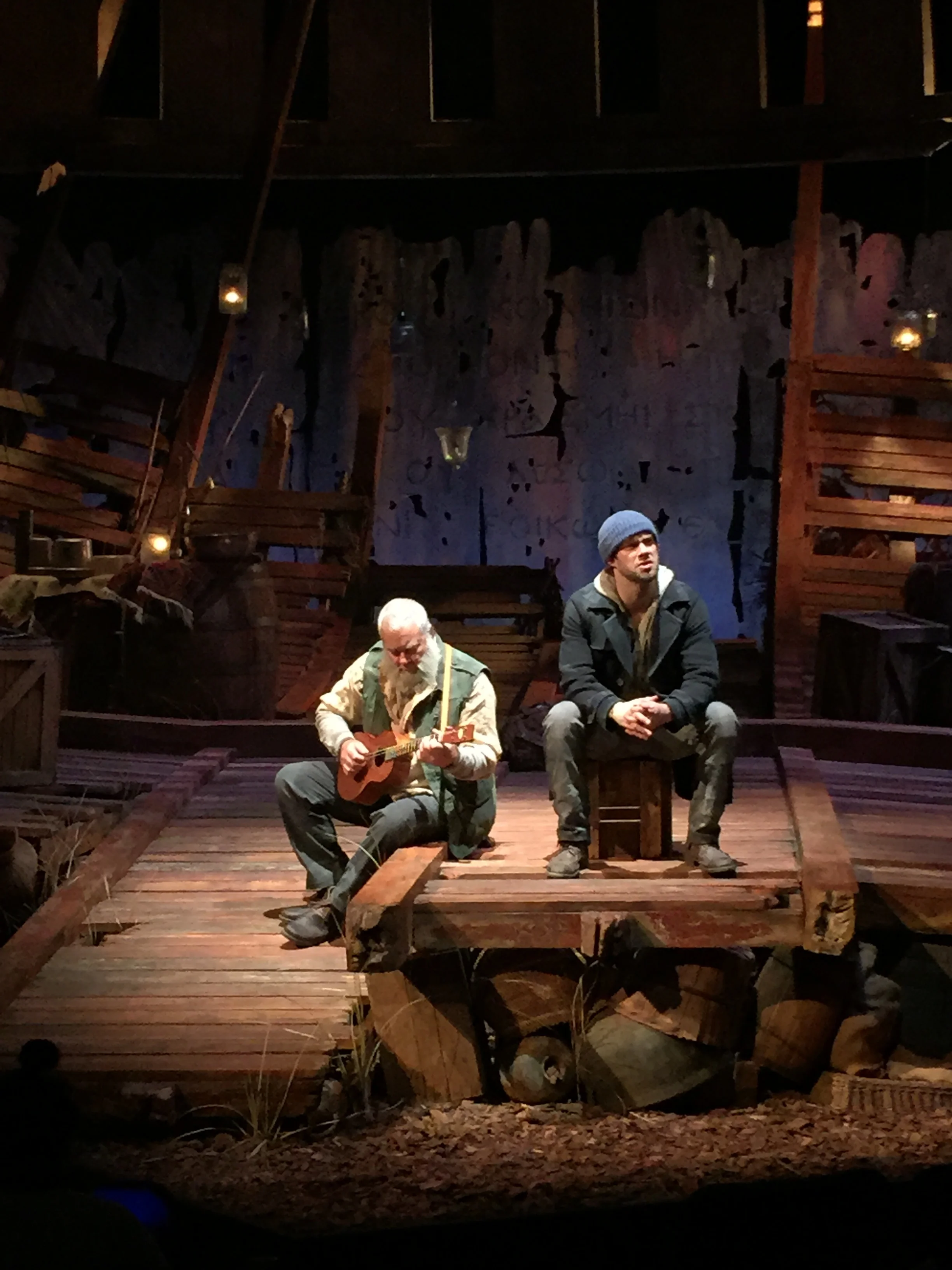 A proscenium thrust is transformed, allowing audience to surround an Italianate pallazzo that welcomes these traveling players from above & below. A few simple trunks contain all the magic.